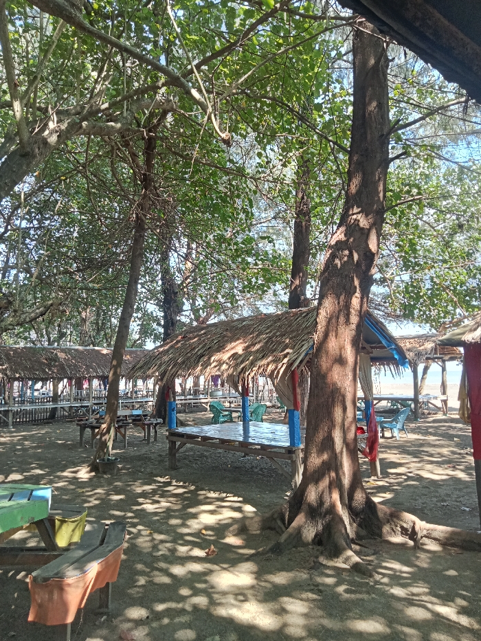 The image depicts an outdoor recreational area located in an unspecified city within "Unknown, Unknown." The scene is characterized by numerous trees with verdant foliage, casting dappled sunlight and shadows onto a dirt ground. In the foreground left, a segment of a wooden picnic table, painted green and blue, with an attached orange bench is visible, displaying a yellow object on its surface. The mid-ground features several open-sided structures, each with a thatched roof supported by wooden posts. A prominent structure in the mid-ground right includes a raised wooden platform and posts painted blue and red. Light blue plastic chairs are positioned around and within this structure. Another similar thatched hut is partially visible immediately behind it. In the background, a row of additional identical or similar thatched-roof huts on raised wooden platforms extends horizontally, suggesting a series of dining or resting areas. These background structures also appear to have wooden railings. No individuals are present within the frame. The overall environment suggests a beachside or forested recreational setting during daylight hours.