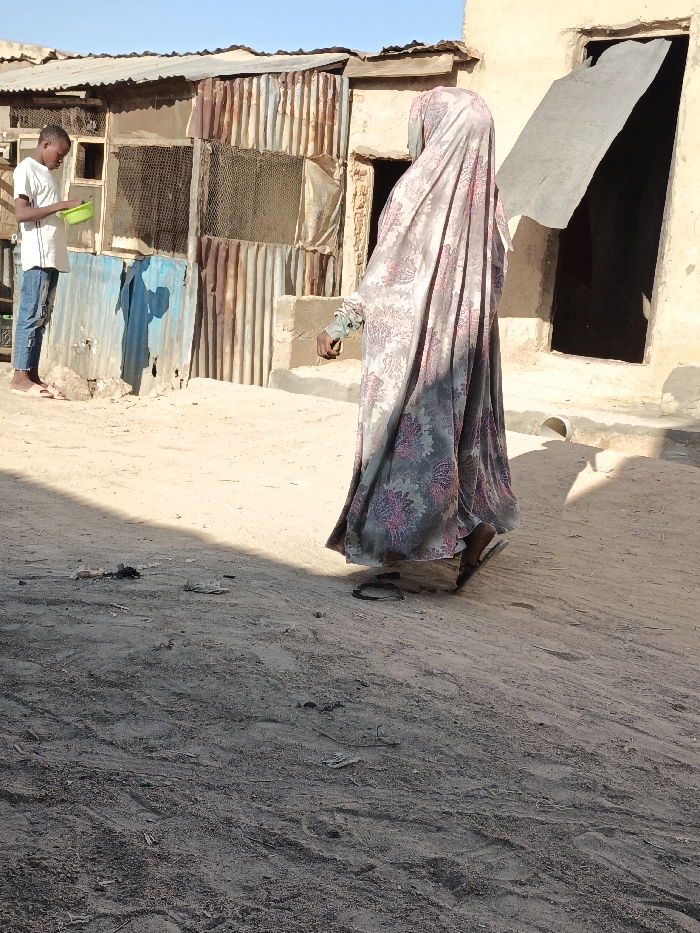 An outdoor scene in Zango, Nigeria, depicts a dusty, unpaved ground under clear daylight. In the foreground, a person draped in a long, flowing grey garment with a pink and purple floral pattern walks away from the viewer, their head and most of their body obscured. Black sandals are visible near their feet on the ground. To the left, in the mid-ground, a young male wearing a white t-shirt and blue jeans stands near a building, holding a bright green bowl and looking down into it. The background features several structures: one constructed from mixed materials including corrugated metal sheets (both rusty brown and faded blue) and wire mesh, and another, to the right, made of light brown mud or adobe with a dark, open doorway from which a piece of light-colored fabric or tarp hangs. Shadows are cast across the dusty ground, and small pieces of debris are scattered. No direct interaction between the two individuals is observable.