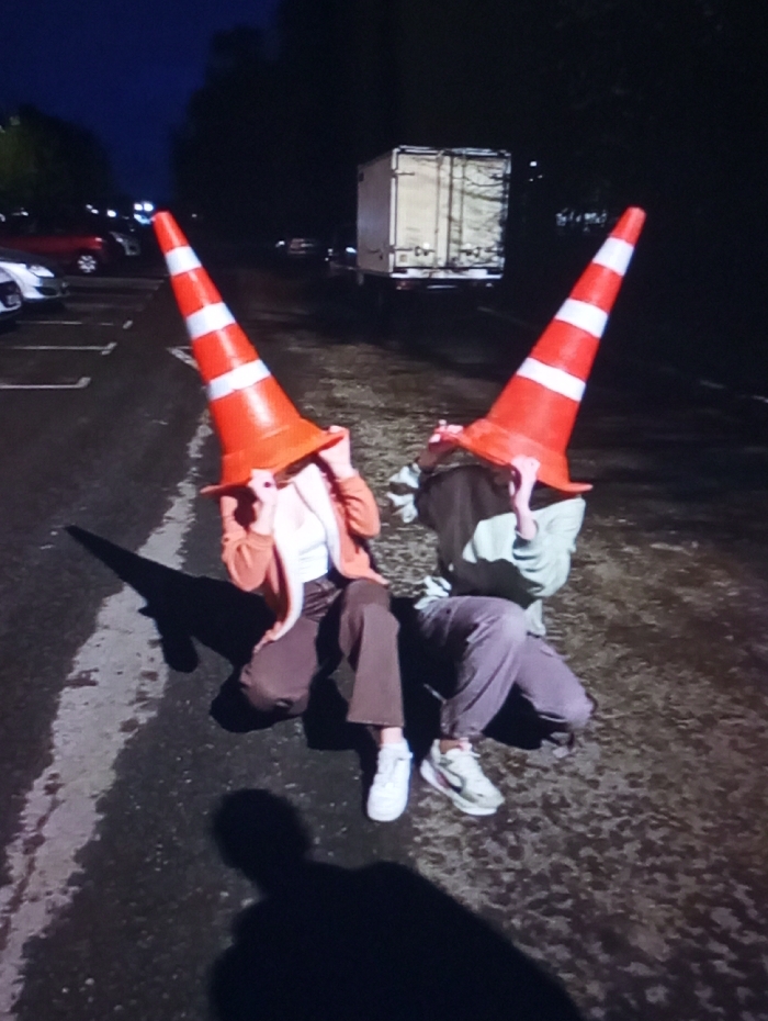 Two individuals are depicted at night in Kukcha, Uzbekistan, crouching on a dark, wet-looking paved surface. Each person has an orange traffic cone with two white reflective stripes positioned over their head, obscuring their faces. The individual on the left wears a light-colored top beneath an orange jacket and brown pants, with white sneakers. The individual on the right wears a light-colored long-sleeved top and purple pants, with light-colored sneakers. Both subjects are holding the cones over their heads with one hand. Long shadows extend from their figures towards the foreground. In the background to the left, multiple parked vehicles are visible in a designated parking area. To the center-right, a white box truck with a dark trailer is present. The scene is dimly lit, with the foreground subjects appearing illuminated by a direct light source.