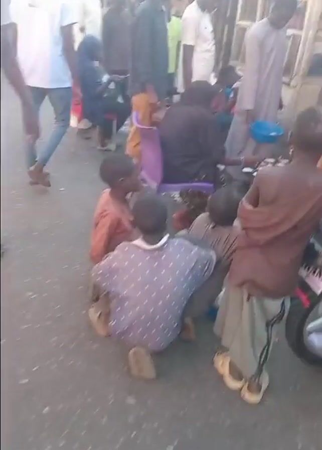 group of people, mostly children, gathered around something on the ground in a public setting. Several adults are standing in the background. The children appear to be kneeling or squatting, looking at or interacting with something in front of them. A motorcycle is parked nearby on the right side of the frame. The ground appears to be a paved road or street. The lighting suggests it is daytime. The overall scene seems to depict a casual gathering of people in a public area.
