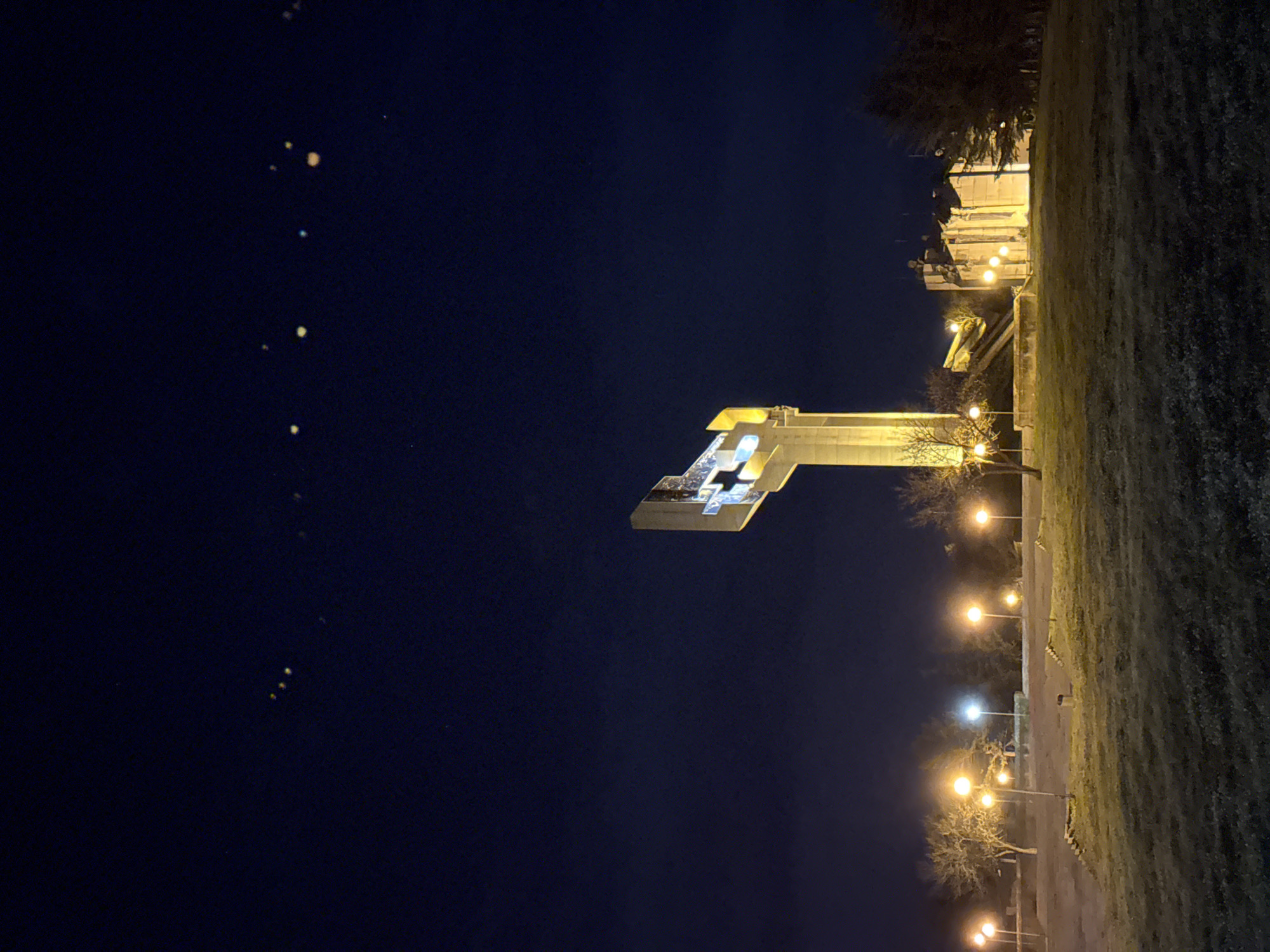 night view of the Defenders of Stara Zagora Memorial Complex in Stara Zagora, Bulgaria. The illuminated monument is the main subject, set against a dark blue sky. To the right, there is a grassy area and trees, illuminated by streetlights. There are a few light spots in the sky on the left. The image is rotated, presenting a sideways view of the scene.