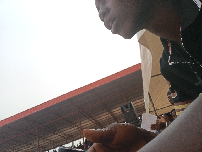 The image depicts an outdoor public gathering in Zango-ndaji, Nigeria, captured from a low-angle perspective. In the immediate foreground, a dark-skinned individual, partially visible from the chest up and right arm/hand, is focused downward on a dark-colored smartphone held in their right hand. This person wears a black garment, likely a jacket or hoodie, featuring a zipper and red and white striped detailing near the collar. A silver-colored chain with a dark cross pendant hangs around their neck. Behind the foreground subject, a large, dark speaker on a stand is visible, positioned under a substantial, red-roofed structure with an exposed metal truss system. This structure extends horizontally across the midground, indicating a stadium-like or arena-like setting. Underneath this covered area, numerous individuals are visible, forming a crowd. To the right of the foreground subject, a portion of a light-colored fabric canopy or tent is present. Further back, another dark-skinned individual, wearing a striped shirt, is visible behind the canopy, and another person holds a white sheet of paper. The upper left portion of the frame is dominated by a bright, overcast sky.