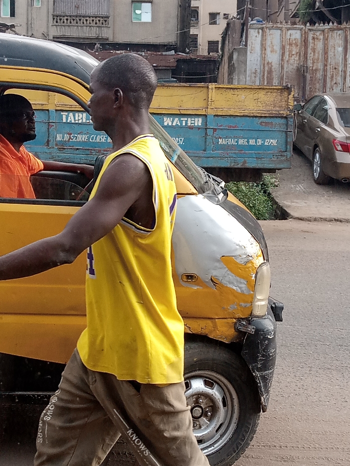 The image depicts a daytime street scene in an urban area of Nigeria, city Unknown