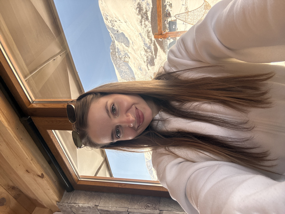 A female subject, appearing to take a selfie, is positioned indoors against a large window overlooking a snow-covered mountainous landscape in Virak, Montenegro