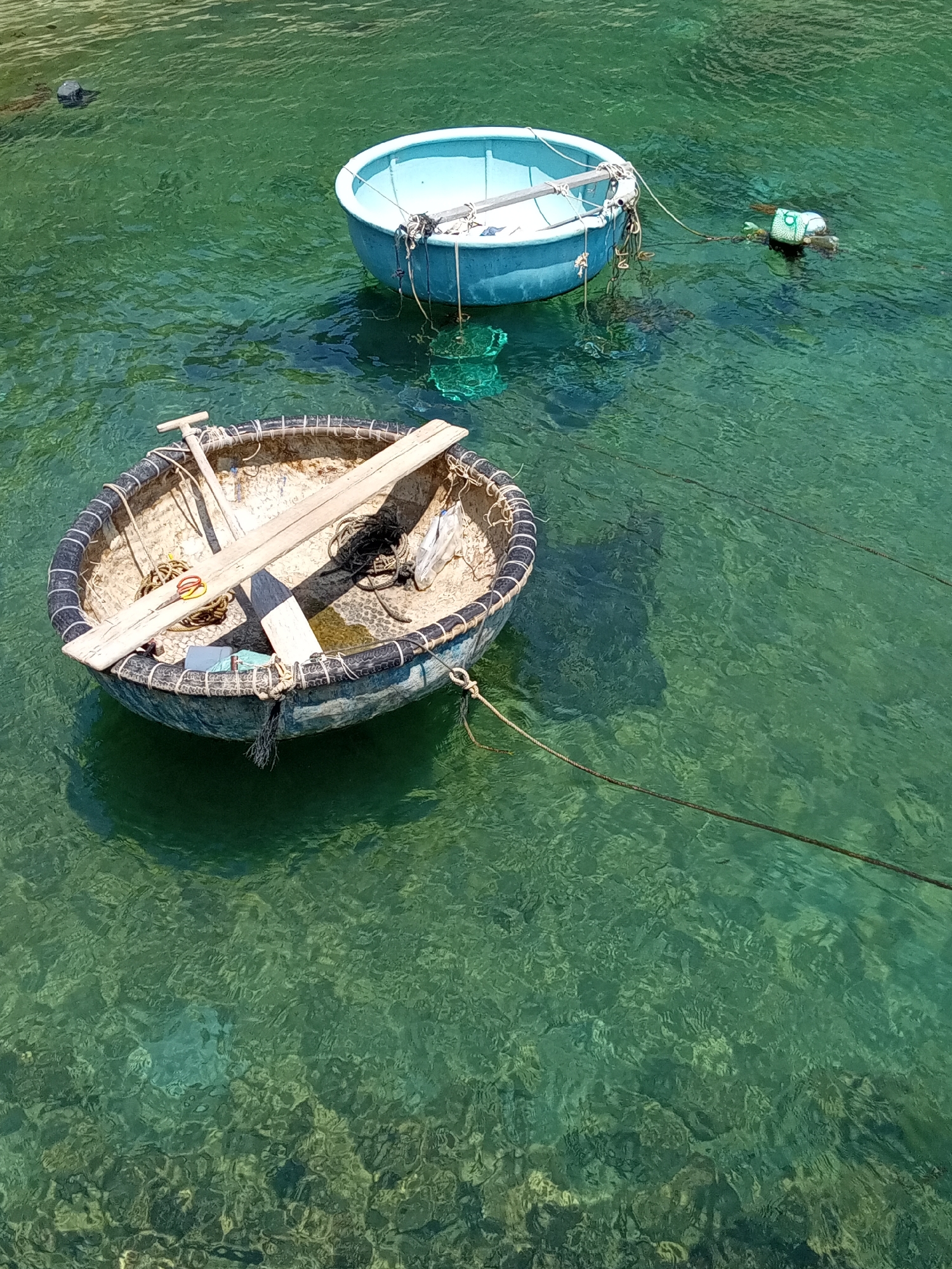 Two circular boats float on clear, green water. One boat is made of woven material with a dark rim and wooden plank in the center, filled with items. The second boat is blue, round, and appears to be plastic. The water is clear enough to see the bottom of the seabed. The boats are tied to ropes with floatation devices. This scene is located in the city of Bắc Nha Trang, Vietnam.