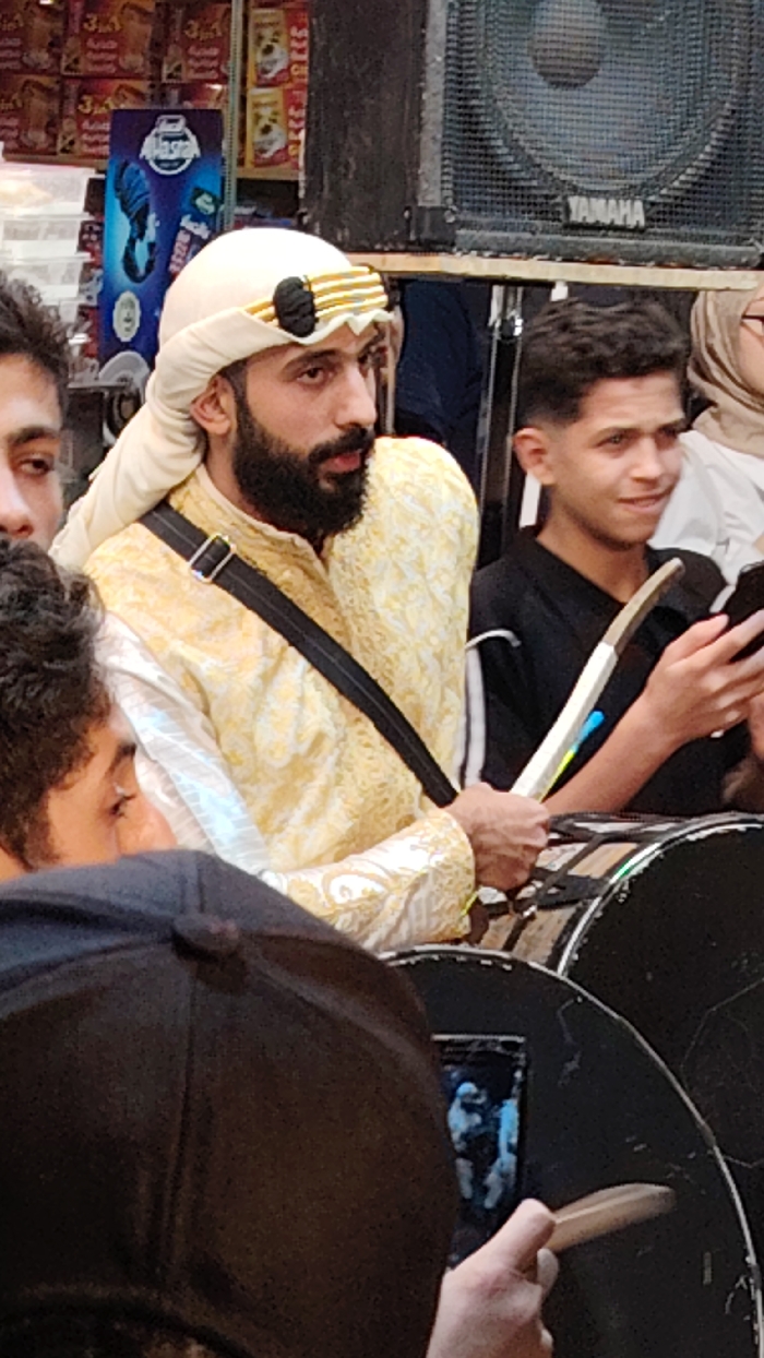 A close-up image depicts a crowded indoor or semi-enclosed scene in Barza Municipality, Syria. The central figure is a male with a dark beard and mustache, wearing a white ghutra secured by a black and gold agal, and a golden-yellow patterned garment over a white underlayer. A black strap diagonally crosses his right shoulder. He holds a drumstick in his right hand, positioned over a large, black drum in the lower mid-frame. To the right, a younger male with short, dark curly hair and a fade haircut, wearing a black t-shirt, holds a drumstick in his right hand near another drum and a smartphone in his left. He is looking towards the right with a slight smile. In the upper right background, a large black Yamaha loudspeaker is visible. The far left background shows a retail display rack with various packaged goods and a blue promotional sign. In the lower left foreground, the back of a person's head wearing a black baseball cap is visible, holding a smartphone with its screen displaying an image. The overall scene suggests a public gathering or musical performance.