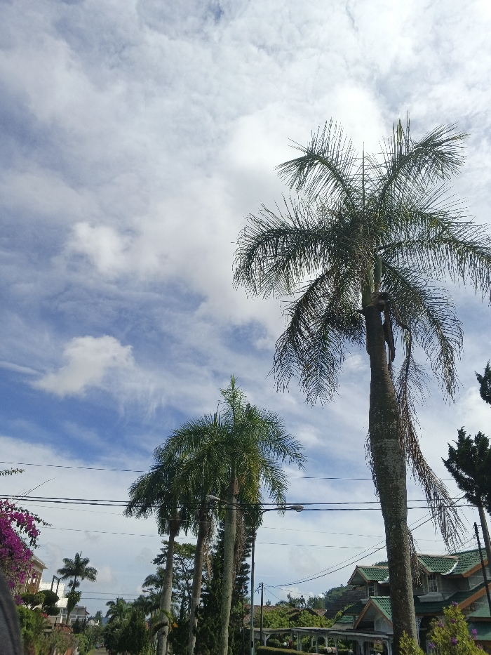 The image depicts a daytime outdoor scene in a tropical environment, consistent with a residential or resort area within Đà Nẵng, Vietnam. The upper portion of the frame features a bright blue sky with scattered white cumulus and cirrus clouds. In the right foreground, a tall palm tree with a slender gray trunk and spiky green fronds stands prominently; several brown, desiccated fronds hang downwards from its crown. Further to the left and receding into the midground, multiple other palm trees of varying heights are visible, characterized by green fronds and light-colored trunks. Below the canopy of these trees, a series of black utility lines extends horizontally across the frame. In the midground on the right, a multi-story building with distinctive green-tiled roofs and light-colored walls is partially visible, nestled amongst trees. On the left side of the frame, a vibrant purple-pink flowering bush (likely bougainvillea) abuts a partially visible white building with an orange roof. A paved road or driveway curves towards the background on the left, flanked by lush greenery and additional residential structures in the distance. A streetlamp fixture is partially visible in the center, above the utility lines. No individuals are present in the scene.