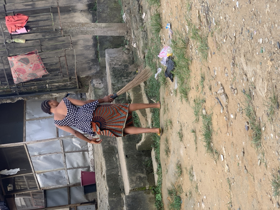 A person stands on concrete stairs, holding a broom and facing a yard. They wear a polka-dot top and a patterned skirt, and yellow sandals. The yard contains dirt, grass, and litter. A building with barred windows and items hanging on the wall is to the left. The scene appears to be outdoors in daylight.