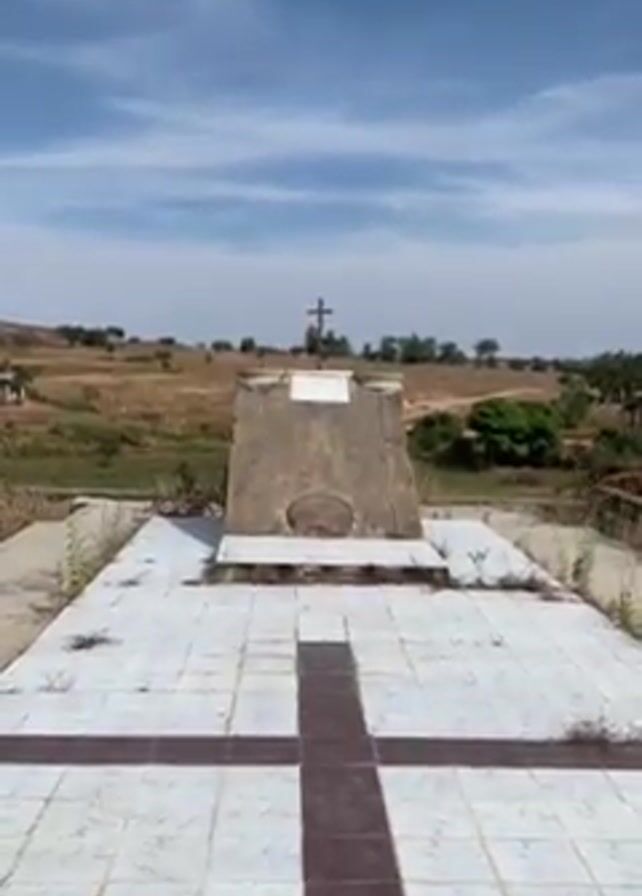 The camera films a concrete platform covered in white tile. A dark brown cross is inlaid into the tile. At the head of the platform is a small concrete monument. In the background, there is a cross on a small hill surrounded by trees. The sky is blue with some light clouds.