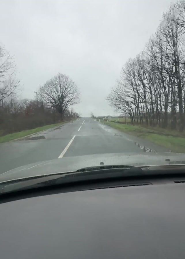 view from inside a car driving on a rural road on a cloudy, wet day. The road is straight with a white line down the middle and some potholes. Bare trees line both sides of the road. The dashboard of the car is visible at the bottom of the frame. Raindrops are present on the windshield.