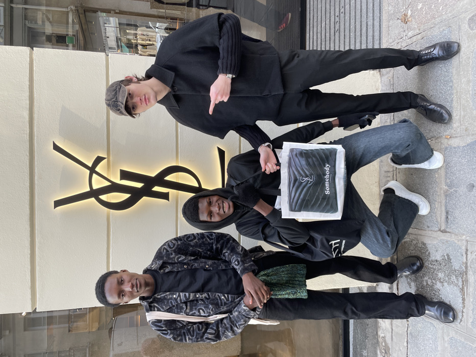 Three young males are posed on a flagstone pavement in front of a cream-colored building facade featuring a large, illuminated black "YSL" logo. This identifies the location as an Yves Saint Laurent boutique in Paris, France. The individual on the left is a Black male, standing upright, wearing a dark patterned long-sleeve shirt over a black t-shirt, black trousers, and black dress shoes. He carries a light beige shoulder bag and holds a folded green knitted beanie in his left hand, looking directly at the camera with a neutral expression. The individual in the center is a Black male, crouching with bent knees, wearing a black hoodie, dark denim flared jeans, and white sneakers. He wears black gloves and holds a white tote bag with "Somebody London" branding and an image of a black quilted handbag. His right hand makes a thumbs-up gesture, and he smiles broadly, looking at the camera. A black duffel bag is partially visible on his left. The individual on the right is a White male, standing upright, wearing a dark baseball cap, a black short cape-style jacket over a ribbed black long-sleeve top, black trousers, and black dress shoes. He wears a silver-colored watch on his left wrist and points his left index finger towards the center individual's tote bag. He maintains a neutral facial expression while looking at the camera. A large glass storefront window is visible to the right, reflecting parts of the street and internal store elements.