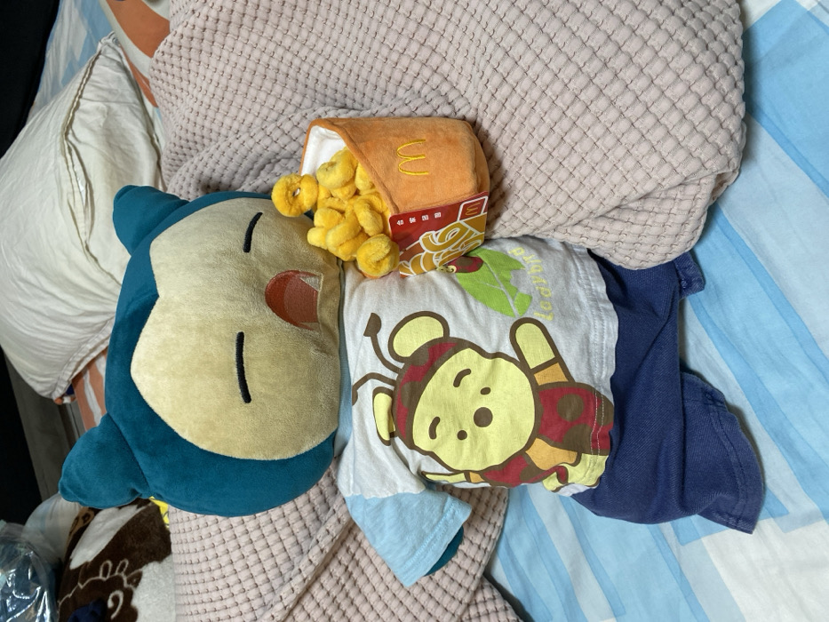A Snorlax plush toy, teal and beige, with closed eyes and an open mouth, is positioned upright in an indoor residential setting. The plush wears a light-colored t-shirt with light blue sleeves and a graphic depicting Winnie the Pooh dressed as a ladybug, along with dark blue pants. It holds a soft, orange McDonald's-branded plush resembling a carton of French fries, which contains multiple yellow, cylindrical plush "fries." A red tag with white Chinese characters is visible on the fries plush. The Snorlax plush is situated on a bed with light blue and white striped sheets. A brown and white patterned pillow is visible in the upper left background, and a plain white pillow is in the upper right background. A textured, light pink or beige quilted blanket or cushion is positioned to the right of the Snorlax plush. There are no discernible features in the image to indicate its specific location within the city of Singapore, Singapore.