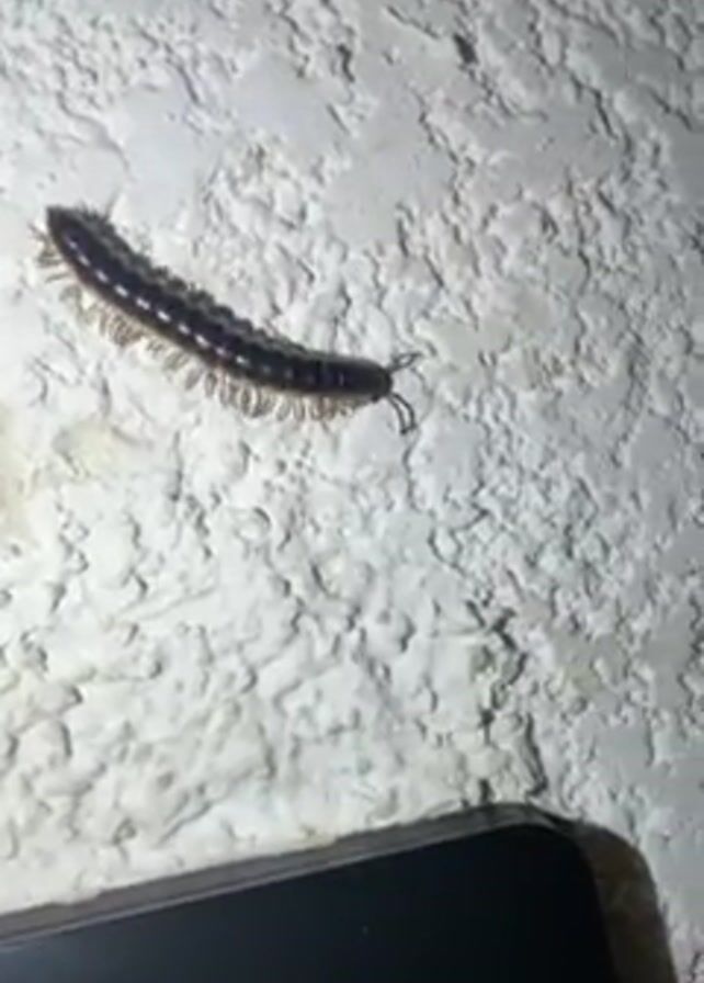 millipede crawling on a white textured wall