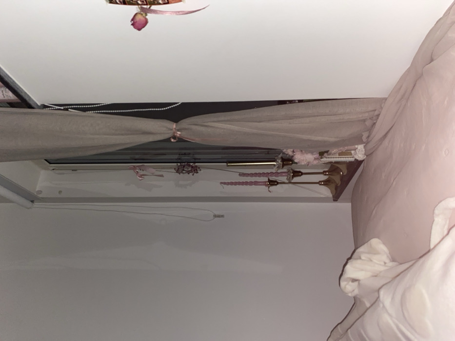 A bedroom scene shows a bed with pink bedding and white pillows on the right. Above, there's a window covered with a sheer, light-colored curtain tied in the middle. A string of pearls adorns the top of the window frame. Decorative items, including brass candle holders with pink candles and small pink ornaments, are placed near the window. A pink rose and ribbon dangle from the ceiling. The walls are white.