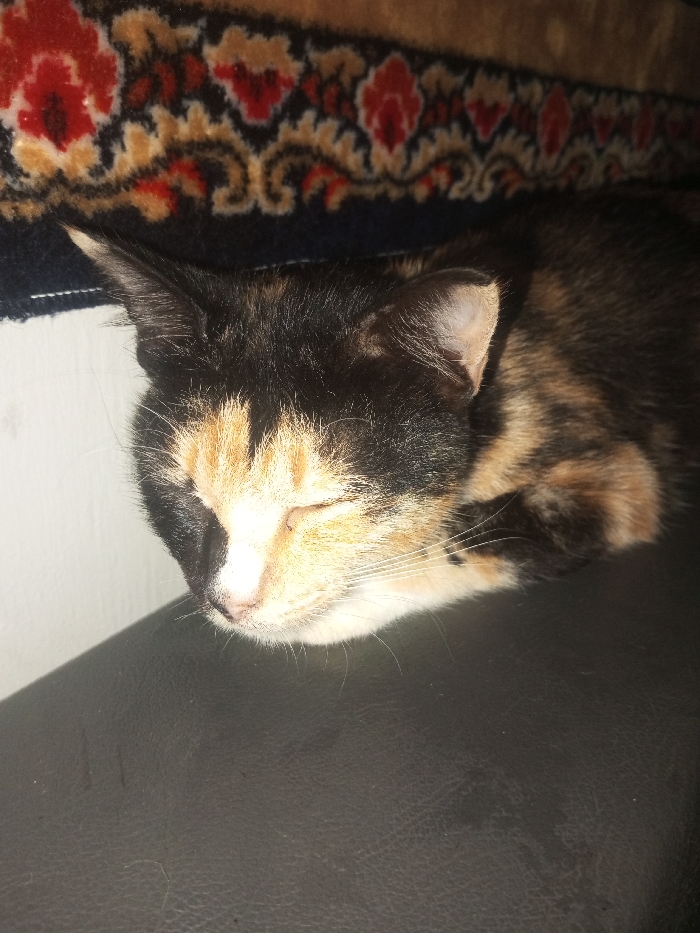 - "A tortoiseshell cat is depicted sleeping or resting with its eyes closed, positioned on a dark, possibly leather, upholstered surface" by FM-Rb2su2, licensed under CC BY 4.0