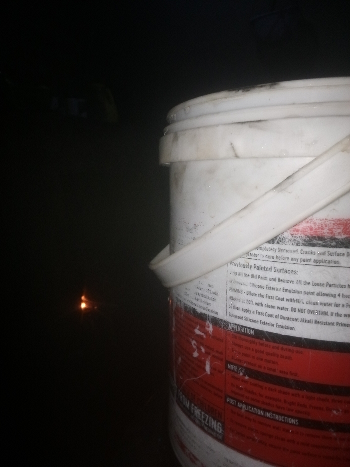 A partially visible, white paint bucket with a plastic handle sits in the dark