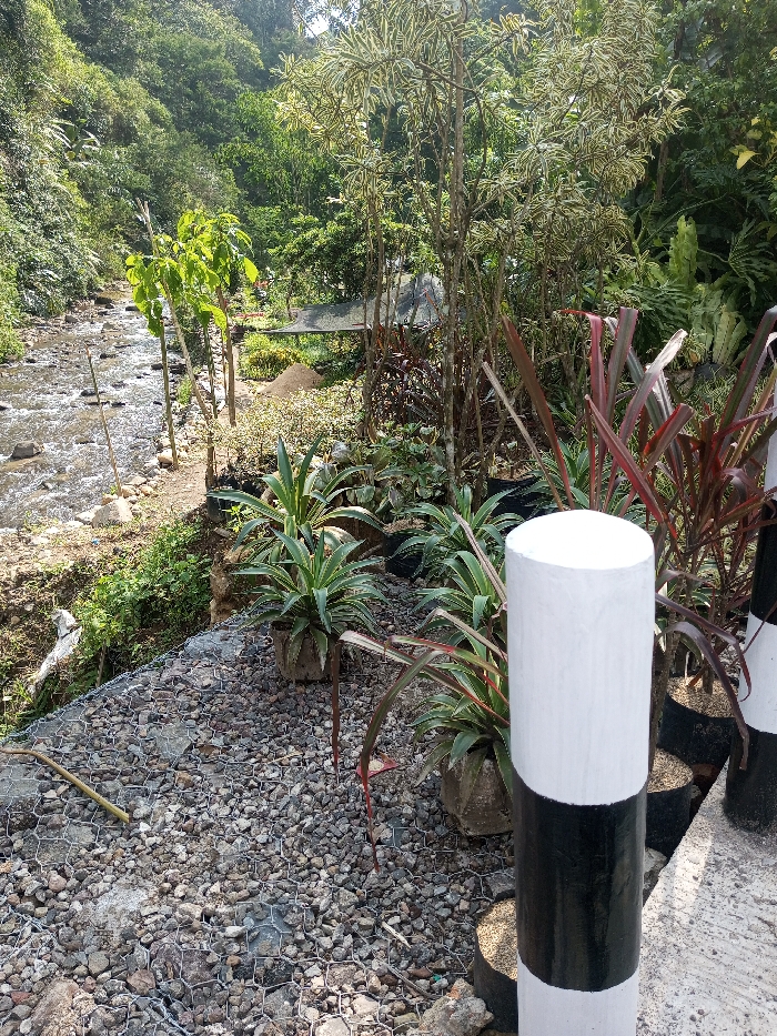 The image depicts a riparian zone within Sandamal Eliya, Sri Lanka. A shallow, rocky stream with flowing water occupies the left side, bordered by dense green vegetation on its far bank. On the near bank, a dark gravel surface, partially covered by a wire mesh, extends towards a paved edge. This area hosts numerous potted plants, including several with spiky green leaves in concrete planters and others with reddish-purple foliage in black polybags. In the immediate foreground, two vertical posts, painted with alternating white and black horizontal stripes, are positioned on the paved edge. The background features lush, forested mountainous terrain. A dark-colored canopy structure, possibly a temporary shelter, is visible amongst the trees, accompanied by a pile of light-colored aggregate material on the ground. No individuals are present in the scene.
