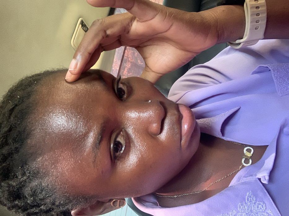 A close-up image depicts an individual with dark skin, positioned within what appears to be the interior of a vehicle. The subject's face is central, exhibiting a glistening forehead and nose, indicative of perspiration or oiliness. Dark, textured hair is visible on the scalp. A small, metallic stud pierces the right nostril. The eyes are dark and directed towards the viewer, while the full lips are slightly downturned. The subject's right hand is raised, with fingers pressed against the forehead. The left earlobe displays a copper-colored, oval-shaped earring. The individual wears a light purple collared shirt and a gold-colored chain necklace featuring a pendant composed of two interlocking rings, one plain gold-colored and one encrusted with small white stones. A light-colored smartwatch or fitness tracker is worn on the left wrist. The background features a light-colored vehicle headliner with a visible overhead console or light fixture, dark seat upholstery, and a blurry reddish-orange light source or reflection through a window. The location in the city of Tumfure, Nigeria, cannot be confirmed from the visual evidence presented in the image.