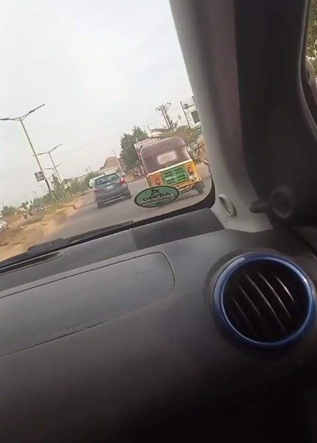 The video is taken from inside a car looking out the windshield. A light gray car is traveling ahead of the vehicle taking the video. A three-wheeled vehicle with a green and yellow color scheme is also ahead. There are streetlights and trees along the roadside. The dashboard of the car is black. There is a round air vent with a blue ring around it visible on the right. A green and white DEKRA inspection sticker is on the windshield.