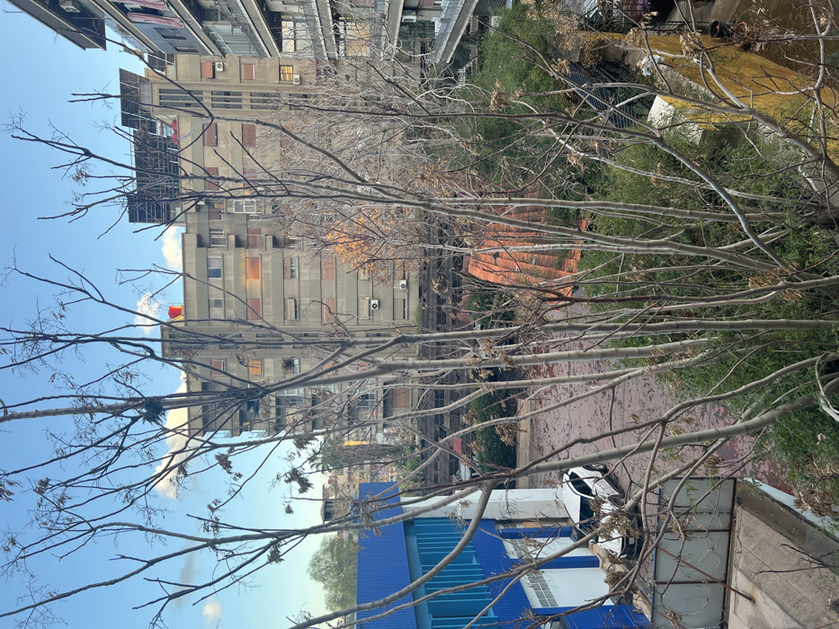 An overhead view captures an urban scene in Al-Qanawat Municipality, Syria. The foreground is dominated by a dense cluster of bare deciduous trees and shrubs, obscuring parts of the view. Beyond these trees, a ground-level area features a wet, dark, possibly paved or unpaved surface. A white compact SUV or hatchback is positioned on this surface, adjacent to a blue-sided industrial-style building on the left. The vehicle appears damaged, with its front end possibly compromised and doors potentially ajar or misaligned. To the right of the ground area, an orange-tiled, conical roof structure is visible amidst dense green vegetation. A low, yellow concrete wall borders the right side of this vegetated area. In the background, a multi-story concrete building with numerous windows, balconies, and exterior air conditioning units stands prominently. Some windows reflect a warm, orange light, suggesting dawn or dusk. Solar panels are mounted on the building's roof, along with a distinct red object, possibly a tank or container. Another multi-story building is partially visible on the far right. The sky is clear blue with scattered light clouds. No individuals are visible.