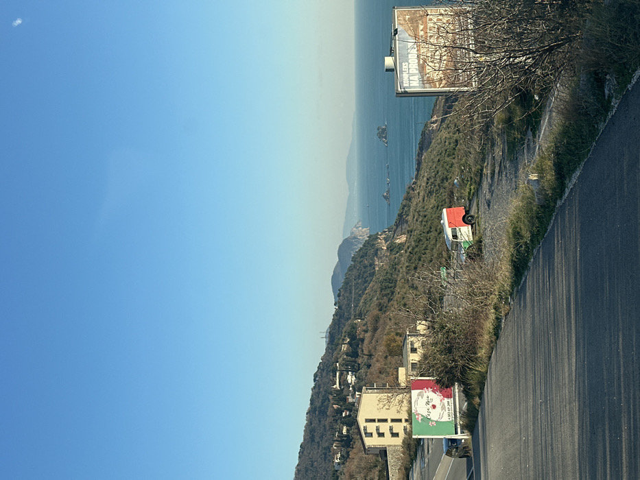 The image depicts a panoramic coastal view in Krstac, Montenegro, under a clear, bright blue sky. In the immediate foreground, a paved asphalt road curves slightly, displaying elongated shadows consistent with a low sun angle. To the left of the road, a multi-story, light-colored building with visible window openings stands on a steep, verdant hillside. Adjacent to the road, a large vertical billboard is present, featuring an Italian flag motif, the text "Casa Mia," and a telephone number. A dark-colored vehicle is parked near the base of this billboard. Further right, on an unpaved dirt area adjacent to the road, a white and red utility vehicle, resembling a food truck, is parked. The word "Laguna" is visible on its side. To the right of this vehicle, another large billboard is positioned, displaying the text "KOMPLEKS NA PRODAJ" (Complex for Sale) above an image of several buildings. The middle ground and background consist of a steep, vegetated coastline characterized by hills covered with sparse, bare-branched trees, shrubs, and green scrub. The land slopes down to the calm, blue waters of the Adriatic Sea. Several small, rocky islets are visible offshore in the sea. Distant landforms are discernible along the horizon line over the water. No individuals are present within the scene.
