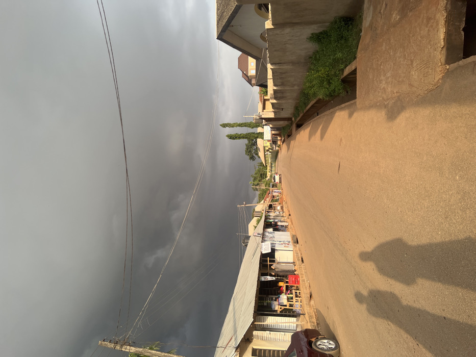 street in Ita Oniyan, Nigeria, with a dark, overcast sky