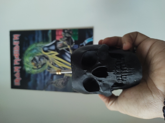 A close-up shot features a black skull held in a person's hand. The skull has visible eye sockets, a nose cavity, and the suggestion of teeth. The background displays a slightly blurred image of an Iron Maiden album cover, featuring their mascot, Eddie, amidst a dark and somewhat chaotic scene. The album's name is vertically aligned along the left edge. The overall composition has a slightly tilted perspective.