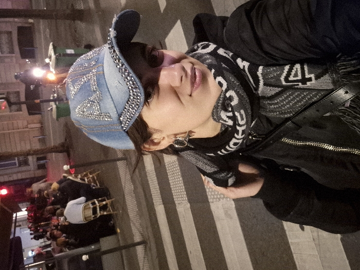 A woman occupies the foreground, taking a selfie on a city street at night in Paris, France. She wears a light blue denim baseball cap adorned with silver rhinestones spelling "PARIS" on the front and along the brim. She also wears a black and white patterned scarf, a black zippered jacket, and large silver hoop earrings, exhibiting a subtle smile. The subject stands on a pedestrian crosswalk marked with white parallel lines. To the left in the midground, multiple individuals are seated at small tables in an outdoor dining area of a cafe or restaurant. In the background, a red traffic light, two green public trash bins, and a person riding a motorcycle with an illuminated headlight are visible on the right. City buildings and trees line the street, illuminated by artificial streetlights under the night sky.