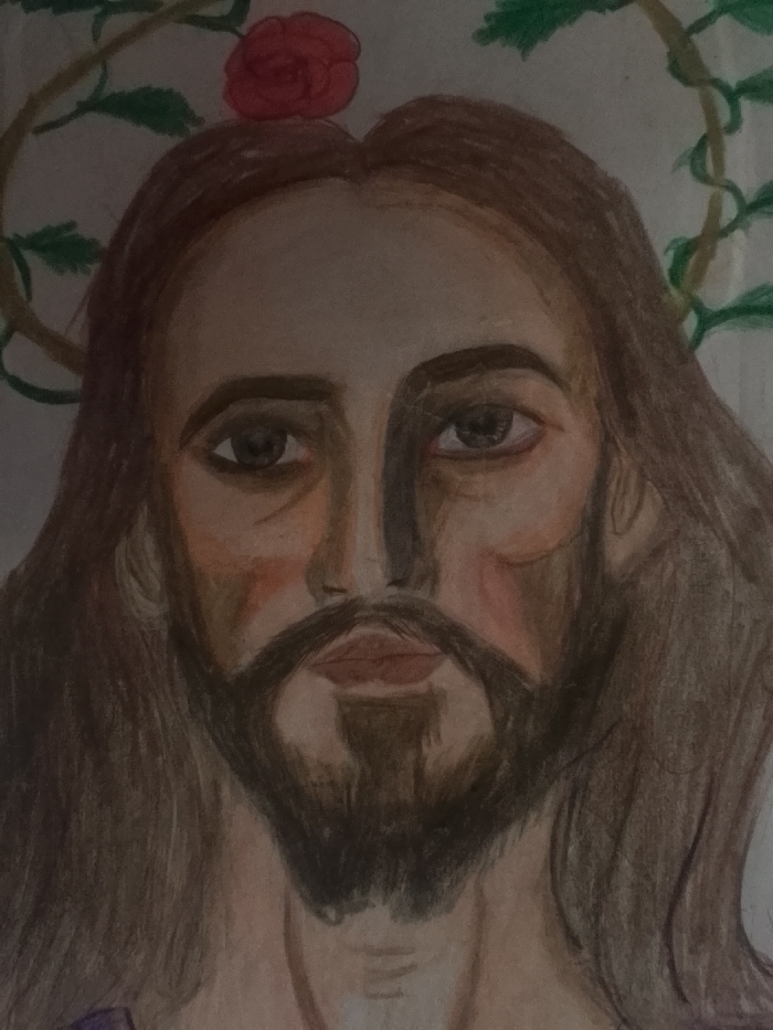 A drawing depicts a solemn-faced man with long brown hair and a dark beard. A single red rose sits atop his head, intertwined with a green, vine-like crown. The man's eyes are dark and expressive, with slight shadows around the face. Light and dark shading define his features, highlighting the cheekbones and jawline. A hint of purple appears at the bottom of the frame, possibly indicating a garment.
