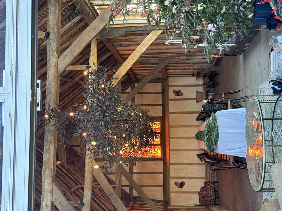 The image displays the interior of a converted timber-framed structure, likely a barn or hall, situated in East Suffolk, United Kingdom. The room features exposed wooden beams and posts, with light-toned wall infill panels. A large, dark-toned chandelier composed of intertwined leafy metalwork and multiple visible light bulbs hangs from the ceiling in the central upper portion of the frame. On the far wall, a rectangular stained-glass window exhibits a pattern primarily in red, orange, and blue hues. Directly below it, a long dining table, covered with a white cloth, is set with a central runner of green coniferous branches. Numerous dark wooden chairs, arranged in rows, flank the table. To the right, a decorated Christmas tree, adorned with light-colored floral ornaments and ribbons, is visible, with dark blue gift boxes at its base. In the immediate foreground, a round glass-topped coffee table with a bronze-toned metal base sits atop a patterned rug. Discarded packaging materials are visible on the floor beside the coffee table. A single patterned armchair is positioned on the far left. A red fire extinguisher is mounted on a wall support on the left. The upper section of the image reveals a modern window or skylight structure. The scene is devoid of people.