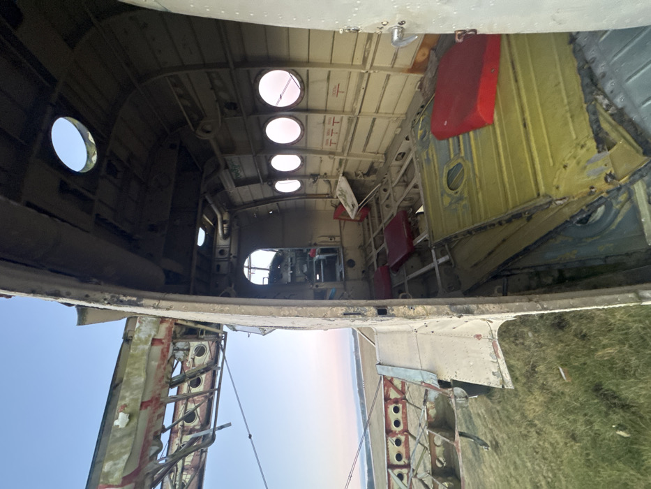 interior of a decaying aircraft fuselage, looking towards the cockpit. Rows of circular windows line the upper section. Stripped-down metal framework and remnants of interior panels are visible. Below, the exterior structure is heavily damaged, revealing the sky and landscape outside. The aircraft appears to be abandoned and in a state of disrepair. The photo is taken from a skewed perspective, enhancing the feeling of decay.