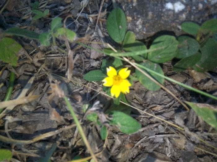 The image displays a close-up, slightly out-of-focus view of ground vegetation. A single, small yellow flower, approximately one centimeter in diameter with five distinct, rounded petals and a darker yellow center, is centrally positioned. Surrounding the flower are multiple green leaves of various plant types, some appearing as ground cover, others as thin, elongated stalks. The ground is composed of dry, fragmented organic debris, including brown and gray desiccated leaves, small twigs, and dried plant matter, with dark soil visible in gaps. The lighting suggests natural daylight conditions. The image does not provide visual cues to confirm a specific city location such as Las Piedras, Venezuela. No individuals or animals are present, and no actions or interactions are depicted.