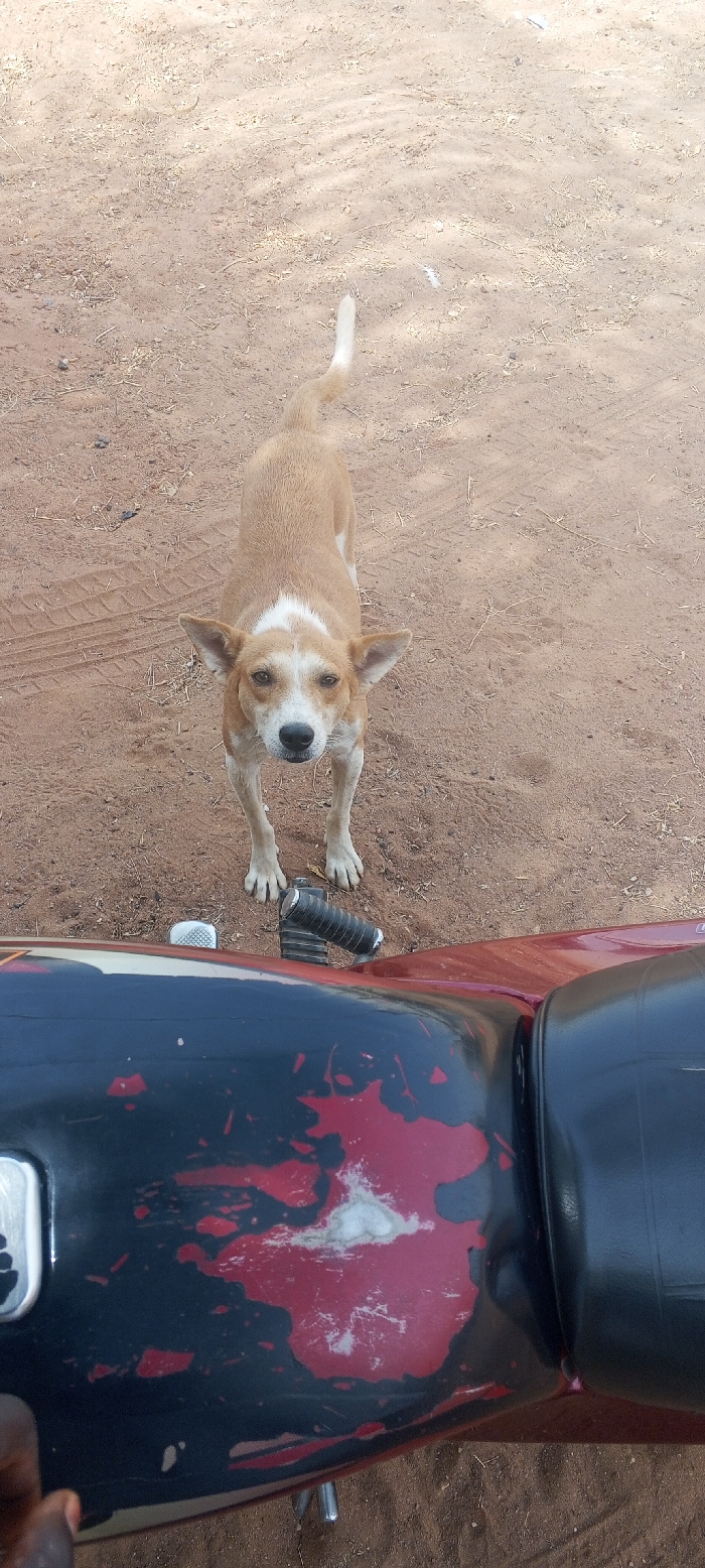 - "This image, captured in Lafia, Nigeria, presents an overhead view of a tan and white dog standing on reddish-brown dirt ground" by FM-SODWY2, licensed under CC BY 4.0