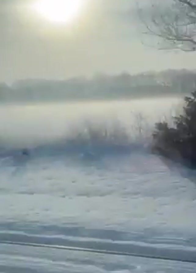 sunny winter landscape. The sun is bright in the sky, shining down on a snowy field. In the distance, there is a light fog over what appears to be a body of water, with some tree lines visible through the mist. The camera appears to be moving alongside the snow-covered ground.