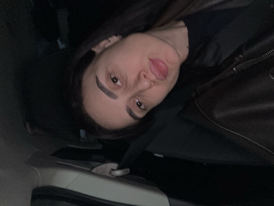 A woman with dark hair is angled and facing the camera with her tongue sticking out. She is wearing a black top and a dark leather jacket. A car seatbelt is visible across her chest. The background includes parts of a car interior, such as a white door panel. Lighting appears to be dim.