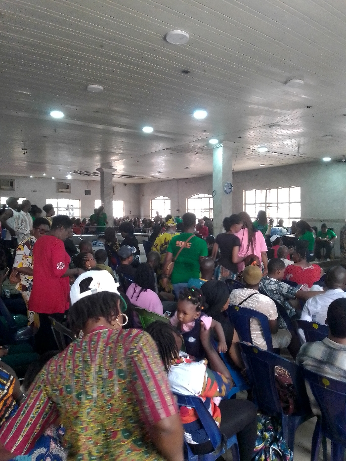An indoor gathering features a crowd of people seated on blue plastic chairs in a large, bright hall. Many are adults, and at least one toddler is visible, being held by an adult. Some individuals are wearing green shirts with lettering. The hall has a high, white ceiling, multiple windows, and a support column. The atmosphere is casual and engaged.