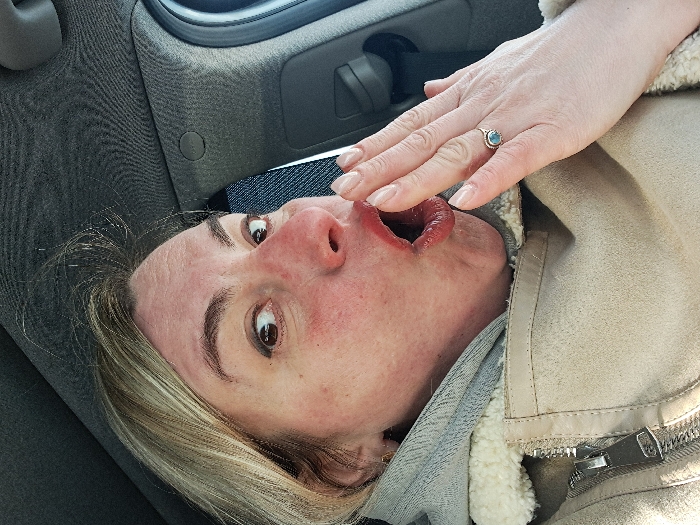 An adult female is depicted in a close-up, upward-angled shot from within a vehicle in Saransk, Russia. She has blonde hair and fair skin with reddened cheeks. Her eyes are wide and dark, looking towards the right of the frame, and her mouth is open in an "ooh" shape, revealing red lips. Her right hand is raised, partially covering her mouth, with the palm facing outward and fingers slightly spread. A ring with a circular, light blue or green stone set in gold is visible on her right ring finger. She wears a beige or tan zippered jacket with a prominent silver zipper, revealing a cream-colored shearling lining at the collar and a grey hooded garment underneath. The background consists of the dark grey fabric headliner of the vehicle's interior, with an "AIRBAG" indicator visible on the upper right side near a window and a dark strap or seatbelt component.