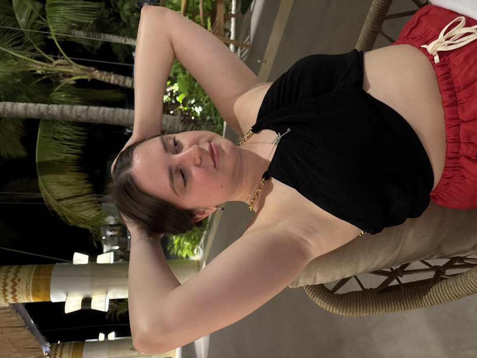 A woman poses while sitting on a chair. She wears a black top with gold chain straps and red shorts with a white drawstring. Her hair is short and dark. She has both arms raised behind her head. Palm trees are visible in the background. The photo appears to be taken outdoors at night.