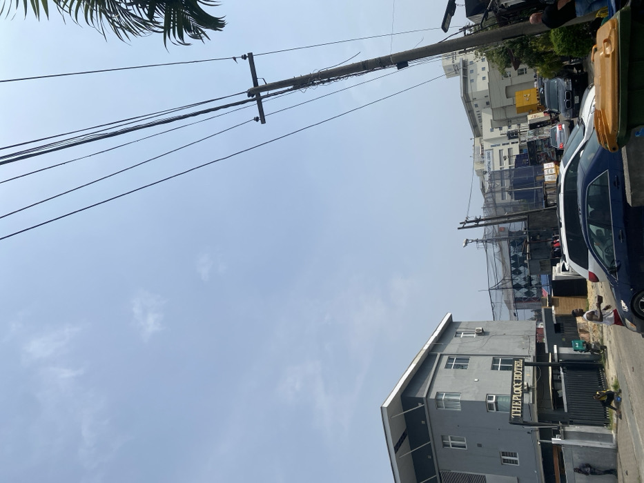 This image captures an urban street scene under a clear, light blue sky with minimal, wispy clouds. The location is an urban area in Nigeria, identified as Ilado, with a visible sign for "Admiralty Hospital Lekki" on a prominent white multi-story building in the background. In the foreground, a dark blue sedan and a white SUV are visible, seemingly part of slow-moving traffic on an asphalt road. To the right, a yellow and green lidded trash bin stands on the roadside. A utility pole made of concrete or wood, with multiple black power lines, rises from the right side of the frame, partially obscured by green palm fronds at the top right. On the left, a grey, multi-story building with a distinctive white-trimmed flat roof is identified by a sign as "THE PLACE HOTEL." The building features multiple white-framed windows and an air conditioning unit on its side. In front of the hotel, a black metal fence and gate are present. A person in dark clothing stands near the gate, and another individual in a light-colored shirt sits on the ground at the base of the fence. A pedestrian in a white t-shirt and red shorts walks across the mid-ground from right to left, carrying a container. Other indistinct figures are visible further down the street. Additional buildings and structures, including some with dark netting, are discernible in the mid-distance beyond the vehicles.