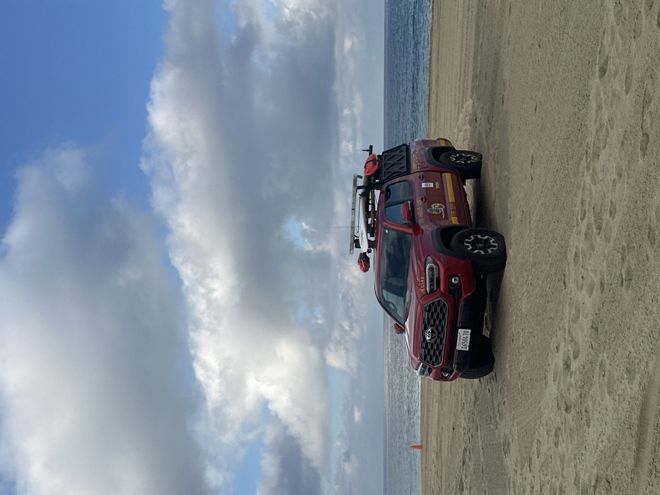 A red Los Angeles County Fire Department truck, equipped with rescue equipment, is parked on a sandy beach
