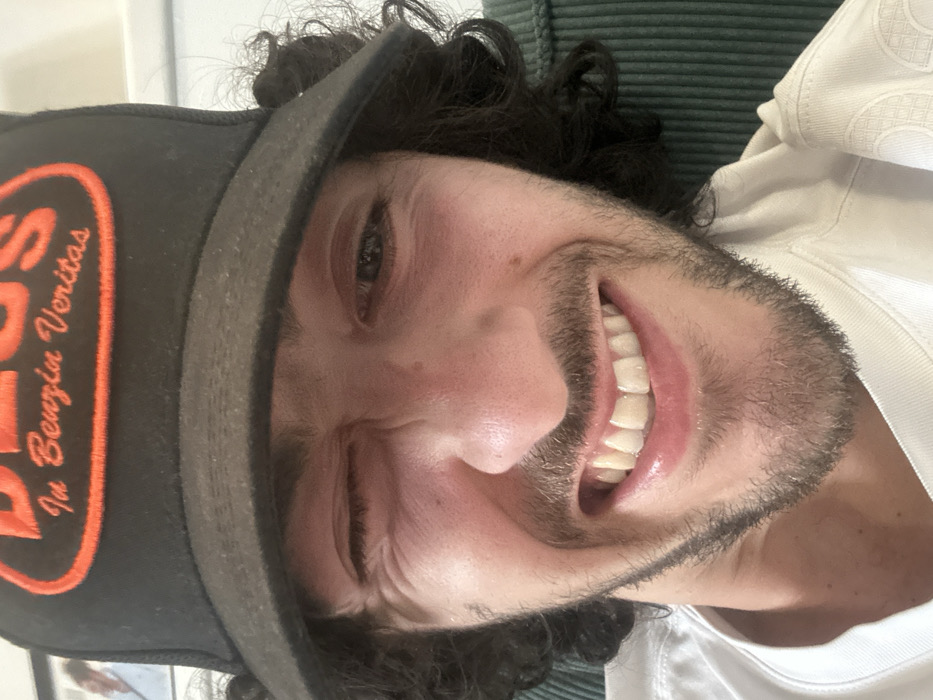 The image presents a close-up, head-and-shoulders portrait of a male individual, stated to be located in Carnin, France, within an indoor environment. The subject, who appears to be an adult male with dark, curly hair, is wearing a black baseball cap featuring an orange embroidered patch with the text "DEUS In Benzin Veritas." His right eye (viewer's left) is tightly winked, creating prominent crinkles at the corner, while his left eye (viewer's right) is open and visible. He displays a broad smile, revealing both upper and lower teeth. The subject has visible facial hair, characterized as stubble or a short beard. He is wearing a plain white t-shirt. The background is partially visible: a light-colored wall or surface behind his head and left shoulder, and a segment of ribbed green fabric, possibly upholstery, behind his right shoulder. The lighting appears bright and direct.