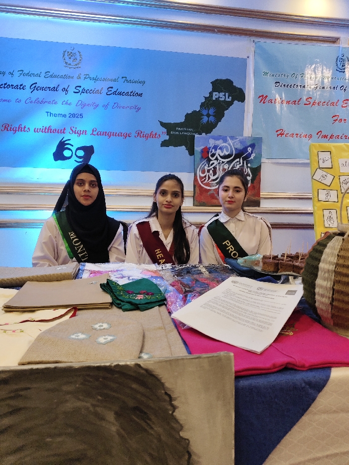This image captures an indoor event booth in the Blue Area, Pakistan. Three young women, appearing to be students, are seated behind a table, facing the viewer. The woman on the left wears a black hijab and a green sash labeled "MONITOR." The central woman has dark, shoulder-length hair and wears a maroon sash labeled "HEAD GIRL." The woman on the right has dark hair and wears a green sash labeled "PRO." All three wear white button-down shirts and maintain a neutral expression. The table in front of them is covered with a blue and white patterned cloth and displays various items. These include a stack of flat, light-brown fabric items, a folded green embroidered fabric, several clear plastic bags containing colorful textiles, a white document with visible text and what appears to be a UN logo, and a tray holding multiple small, square brown cakes or pastries, each with a toothpick. A large, spherical, striped object is partially visible on the far right of the table, and a dark-colored art piece is partially seen in the bottom left foreground. The background features multiple display banners and artworks. A large blue banner on the left, bearing the Government of Pakistan emblem, states "Ministry of Federal Education & Professional Training," "Directorate General of Special Education," and "Welcome to Celebrate the Dignity of Diversity," with "Theme 2025" and "Rights without Sign Language Rights" visible. Below this text, a stylized hand gesture forming the number '69' is displayed. Centrally, a map of Pakistan is shown, with the text "PSL" and "PAKISTAN SIGN LANGUAGE," and four intertwined hands superimposed over the map. Below the map, a painting features red and white Arabic calligraphy on a dark background. To the right, a second blue banner, partially visible, mentions "Ministry of Federal Education & Professional Training," "Directorate General of," "National Special Education," and "For Hearing Impaired." A yellow display board on the far right exhibits multiple small illustrations of hand gestures, likely demonstrating sign language. The environment appears to be an event hall, with light-colored architectural detailing visible on the walls.