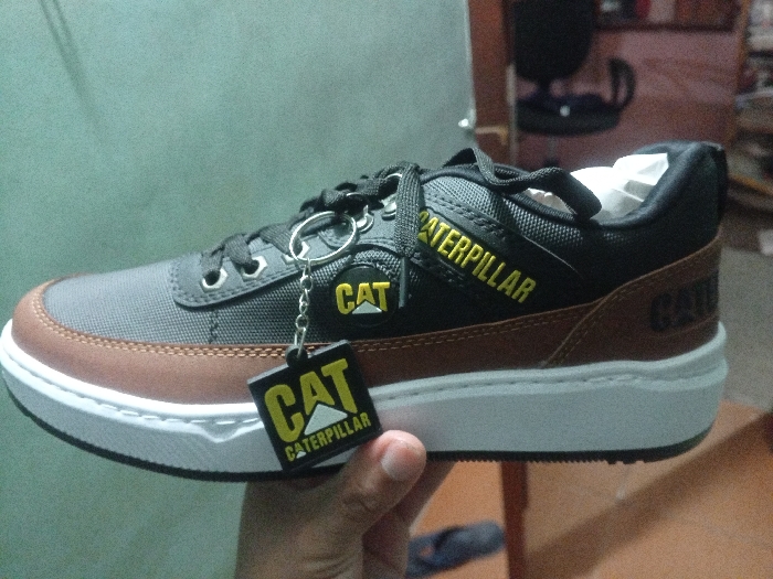 - "A single, new Caterpillar-branded athletic-style shoe is held by a left human hand in an indoor setting" by FM-67jFM2, licensed under CC BY 4.0