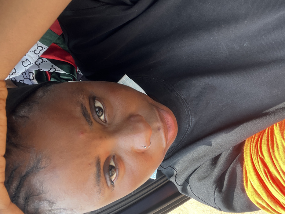 The image displays an upward-angled, head-and-shoulders portrait of an individual with dark skin, dark eyes, and short, dark hair, captured in a selfie-style. A small silver nose ring is visible in the left nostril, and a light blue disposable face mask is partially visible below the chin. The subject is wearing a black long-sleeved top, with an orange long-sleeved garment visible underneath on the left arm. The upper portion of the subject's right hand is visible at the top of the frame. The background is out of focus, revealing a pattern of white fabric with repeating black 'CC' logos and sections of red and green stripes in the upper right. A dark vertical element and a blurry, light-colored ground are visible on the left. The scene is illuminated by bright daylight, suggesting an outdoor environment or proximity to an open vehicle. The image itself does not contain discernible visual information to confirm the specific location within Gwagwalada, Nigeria.