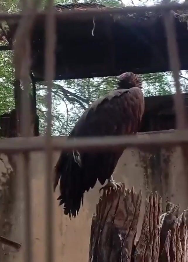 - "A bird, possibly a king vulture, is seen in a cage, perched atop a tree stump" by FM-2RufY2, licensed under CC BY 4.0
