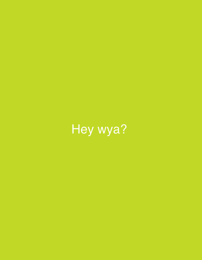 The image displays a solid, vibrant lime green background. White text, centered horizontally and vertically, reads "Hey wya?". No other subjects, objects, people, or discernible environmental features are present. The scene is located in the city of Unknown, Unknown.