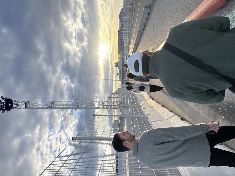 The image depicts an outdoor pedestrian pathway adjacent to a vehicle road, likely within or bordering the Grand Port Maritime de Marseille, France, during late afternoon or early evening. A low sun breaks through a partially cloudy sky on the horizon, casting a golden light. In the immediate foreground, a male subject with short dark hair and stubble is positioned on the left, facing left and looking slightly behind him. He wears a grey/sage green collared jacket and black pants, holding a smartphone in his right hand. To his right and slightly in front, another male subject is seen from behind, wearing a dark olive green jacket and a white baseball cap, with a dark strap of a bag diagonally across his back. A concrete barrier separates the pedestrian path from a multi-lane asphalt road on the right. A red and white painted curb marks the edge of the pedestrian area. Further along the pedestrian path, a line of individuals walks away from the camera. Visible among them are at least three females: one with dark hair wearing a white top and dark pants with a black shoulder bag; another with dark hair in an olive green jacket and blue jeans; and a third partially obscured. To the left of the pedestrian path, a tall metal mesh fence runs parallel to the direction of travel. Behind this fence, on the distant horizon to the left, are several tall buildings. A prominent, very tall lattice-style light tower, featuring a blue-painted upper section and a cluster of spotlights at its peak, stands between the fence and the road. In the mid-distance and background, beyond the road, large industrial buildings or port structures are visible. A multi-deck ferry or large ship is prominently docked or moving on the water line in the background. A white vehicle is visible on the road further ahead. The scene conveys movement and infrastructure typical of a large port environment.