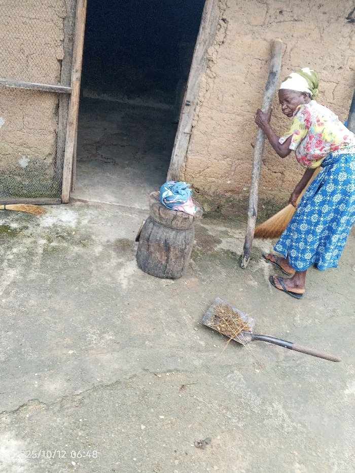 The image captures an outdoor scene in Kamantan, Nigeria, on October 25, 2012, at 06:48 AM. An elderly woman, wearing a yellow floral top, a blue and white patterned long skirt, black sandals, and a white and olive-green headscarf, is depicted actively sweeping a concrete ground surface. She holds a natural fiber broom in her right hand and a long wooden pole, possibly for support, in her left hand, leaning forward as she sweeps. To her left, a dark, cylindrical wooden mortar or stool is present, topped with a folded light blue and pink patterned fabric. Behind these objects, a doorway with a wooden frame leads into a dark interior of an earth-built structure. A square-nosed shovel, partially covered with swept organic debris, lies on the concrete ground in the foreground. A small quantity of additional natural fibers or debris is situated near the doorway's left side. The building's wall exhibits an earth-toned, textured finish.