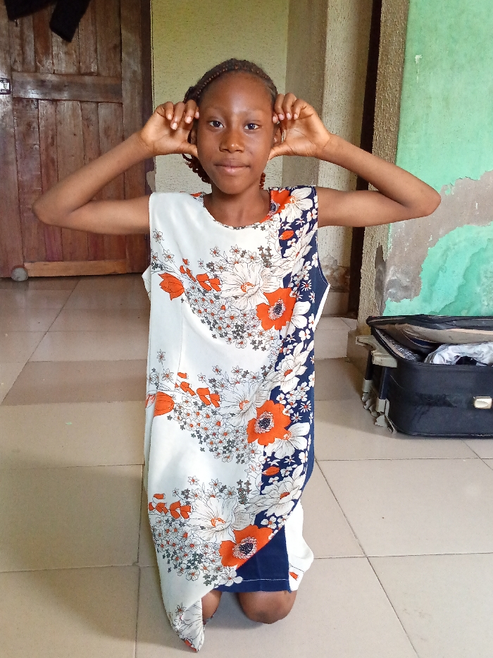 A young female, approximately early to mid-teens, with dark skin and braided hair, kneels on a light-colored tiled floor in Zango-ndaji, Nigeria. She wears a sleeveless dress featuring a white body with large orange and white floral patterns, and a dark blue vertical panel on the right side, also adorned with white flowers. Her arms are bent, with hands lightly touching the sides of her head near her ears. She looks directly at the camera with a neutral expression. The background to the left consists of a wooden door with a visible latch. To the right, a wall with peeling light green paint reveals a darker substrate, and a partially open black suitcase with contents is visible on the floor.