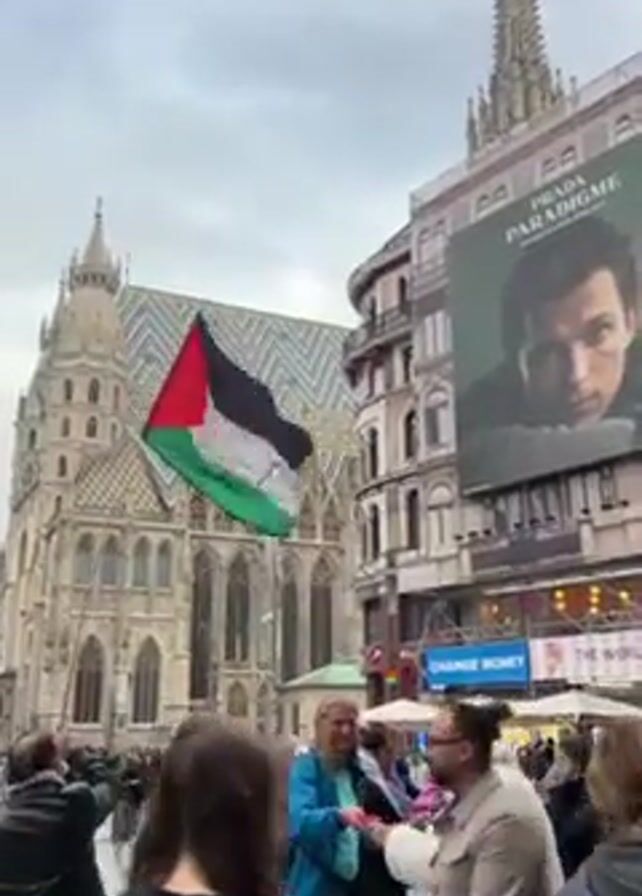 crowd of people in what appears to be a city square. Several people are holding and waving Palestinian flags. In the background, there is a large, ornate building with a tall spire, possibly a cathedral. A large billboard advertises Prada cologne with a picture of a man. People are walking around and the overall atmosphere seems to be that of a protest or demonstration.